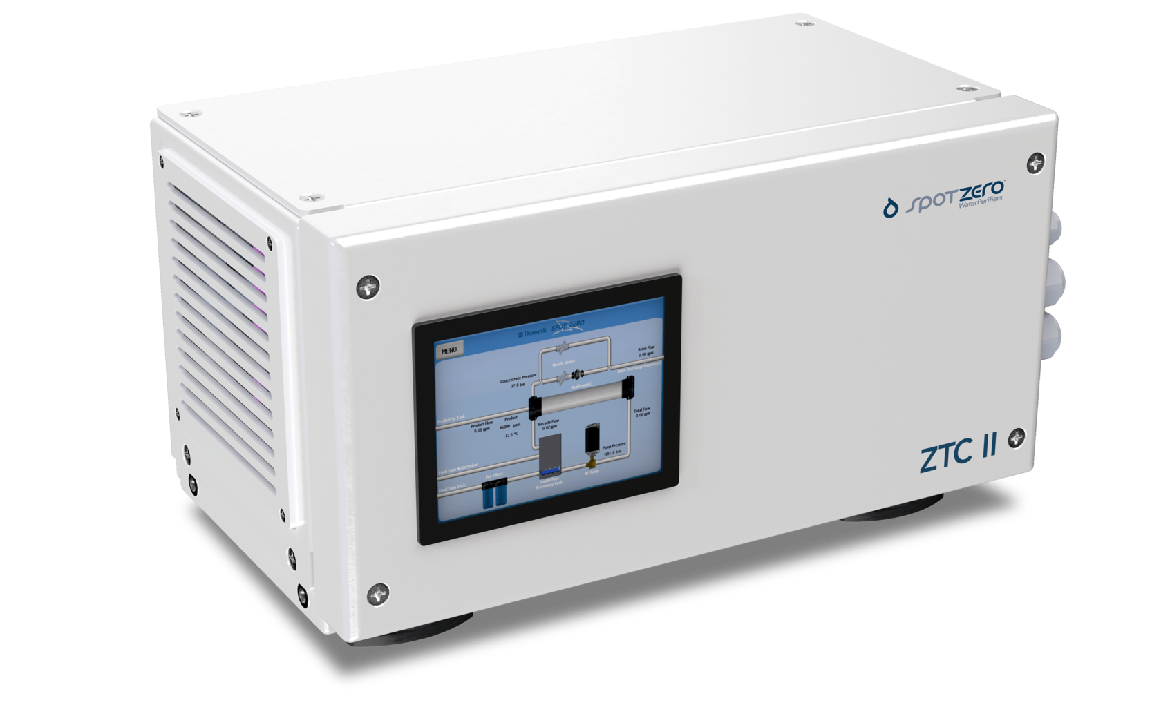 The SpotZero ZTC II is a fully automatic system designed to provide the many benefits you can expect from ultra-pure spot-free water from any onboard watermaker or dockside water source. Every drop of water in and on your vessel with be Spot Free and rid of water-born contaminates. The ZTC II self-regulates pressures and flows to ensure the best quality of water regardless of temperature or water quality. It also features a full color display 7′ touchscreen, mechanical override for redundancy, and programmable automatic freshwater flush to keep your system performing at its maximum potential.